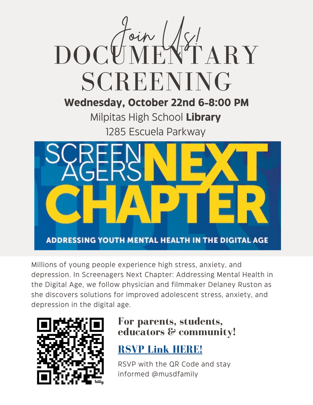 Join us for a FREE screening of Screenagers Next Chapter this Wednesday, October 22 at Milpitas HS Library